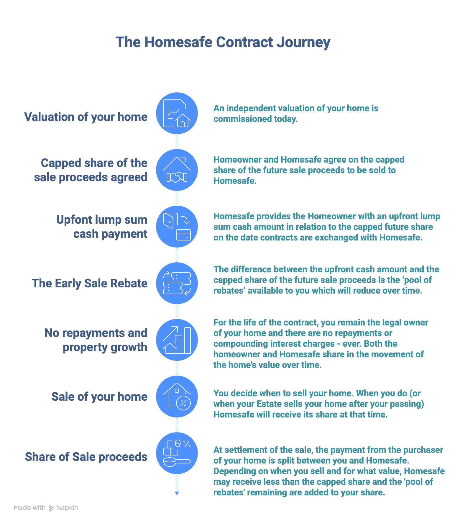 You decide when to sell your home (which may be many years down the track) then, and only then, Homesafe would receive its share of the sale proceeds of your home;